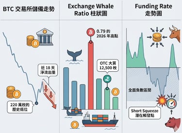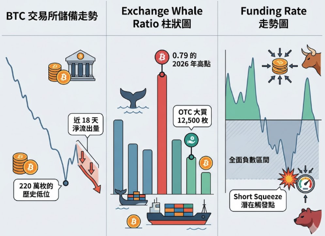 當持幣者把 BTC 從交易所提到自己的錢包,就計一次淨流出。連續 18 天的 BTC 淨流出,累計約 7.2 萬枚 BTC 離開交易所;ETH 同期淨流出約 38 萬枚。交易所的 BTC 總儲備已降至約 220 萬枚,是結構性的持續下降,不是這週突然發生的現象。