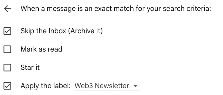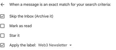 做法是,在 Gmail 的篩選器視窗裡,把以下內容貼到 From 欄位:’’bankless.com OR milkroad.com OR theblock.co’’。接著點擊 Create filter,跟上面的設定方式一樣。這樣一來,只要寄件者符合這幾個網域,信件就會自動被歸到 Newsletter label。