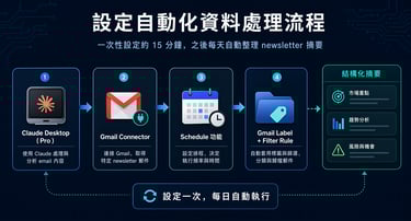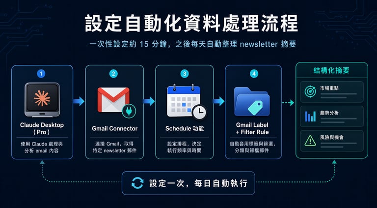 這套流程需要先完成一次性設定,整體大約 15 分鐘。完成後,Claude 就可以每天自動讀取指定 newsletter,整理成一份結構化摘要。
