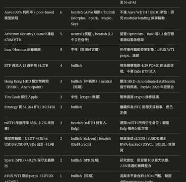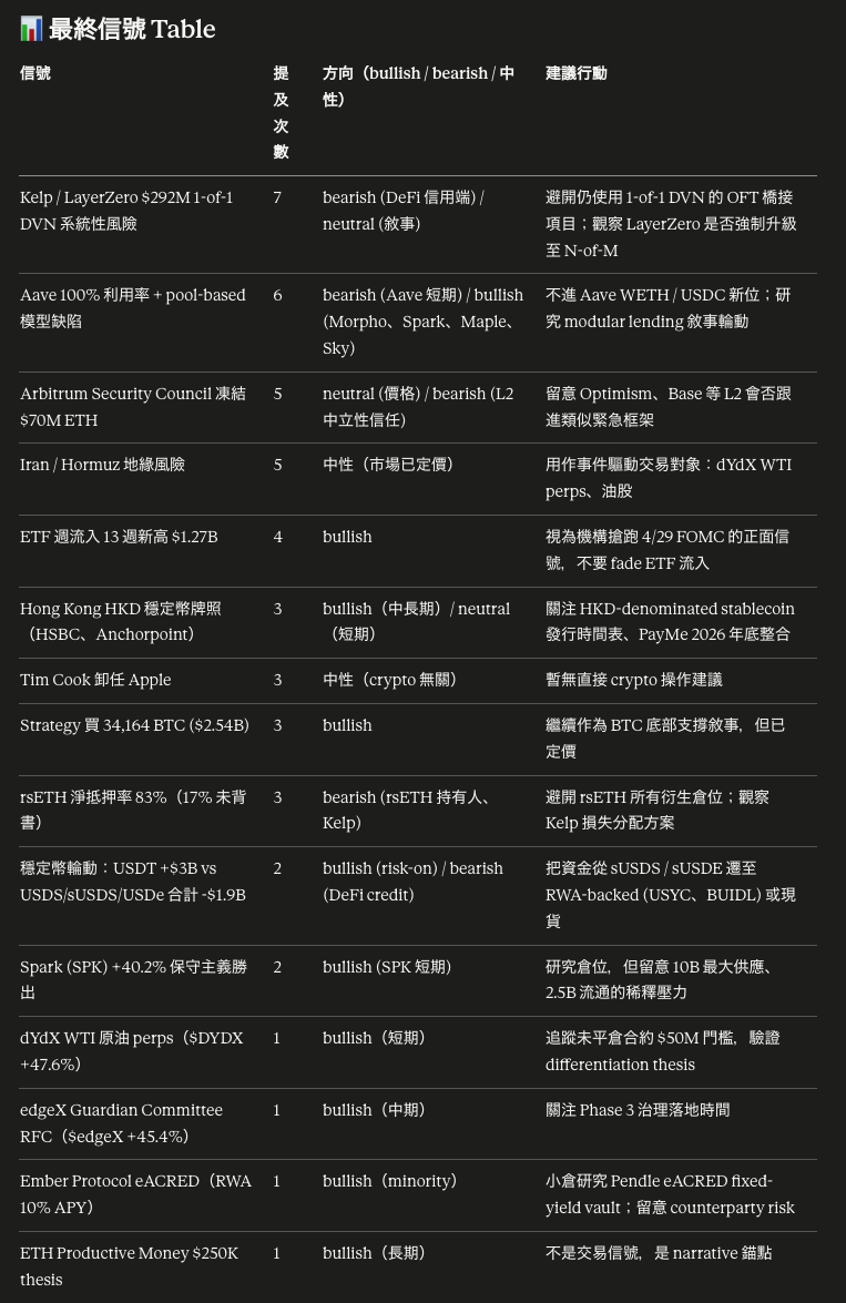 | 信號 | 提及次數 | 方向(bullish / bearish / 中性)| 建議行動 |