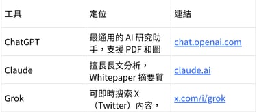 這篇文章分享的工具包,目標是用 AI 工具將這套完整的研究流程壓縮到 10 分鐘以內。看完這篇文章,你將獲得: