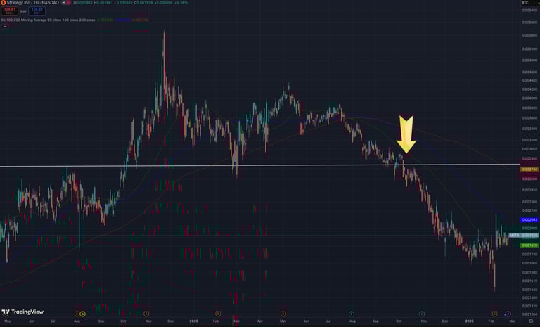 當時,比特幣價格還在嘗試衝擊高點,市場一片看多。但這時 MSTR/BTC Ratio 已經出現了異常,不升反跌。