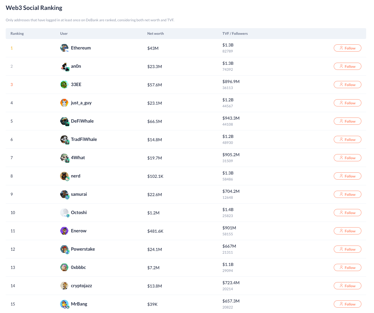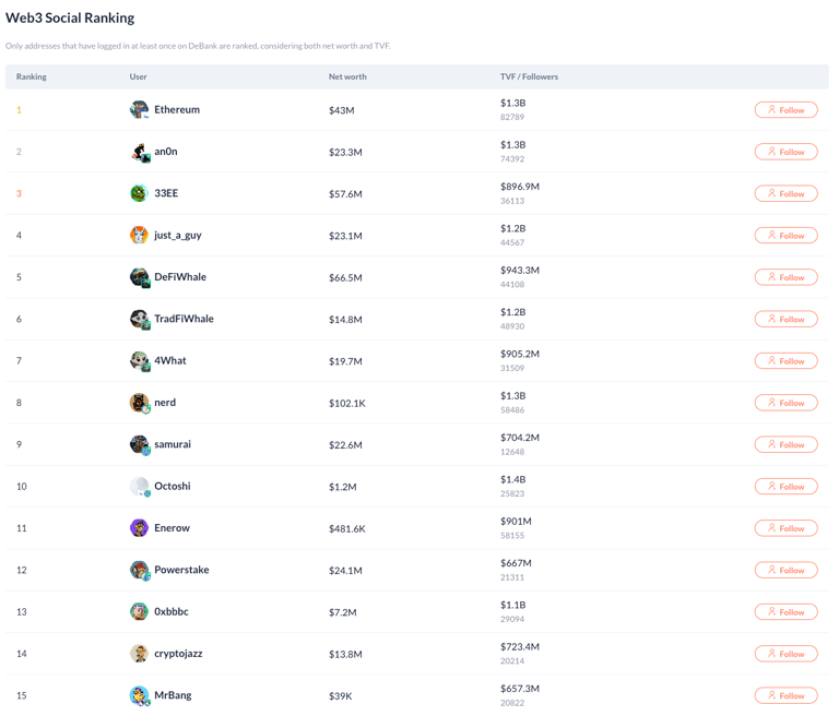 💡 Chainlab 獨門技巧: 查看 DeBank 的 "Web3 Social Ranking",關注排行榜前列的大戶。