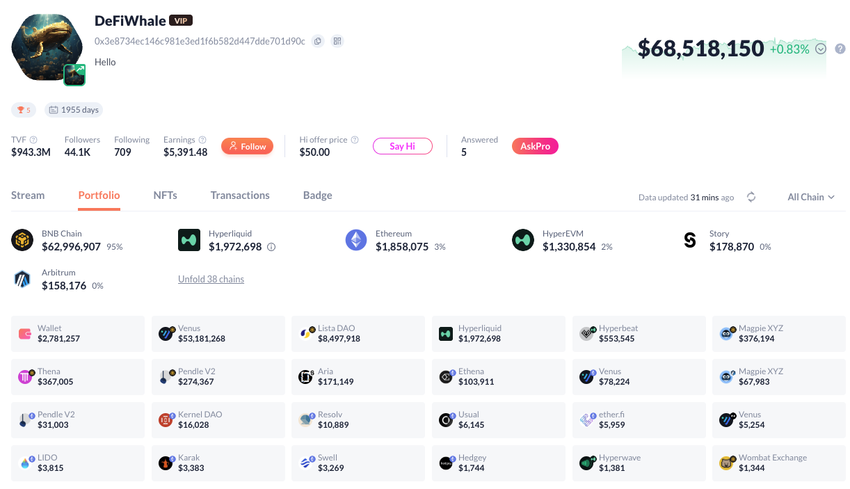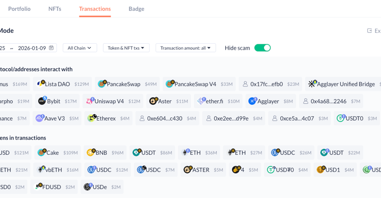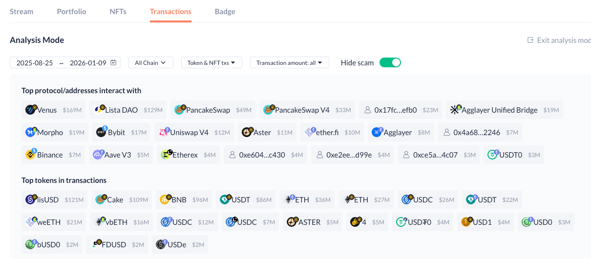 全鏈透視:Portfolio(資產組合): 它會顯示這位大戶在所有區塊鏈(ETH, BSC, Solana, Arbitrum 等)的總資產。如果該地址只有 $100 美金,那麼它肯定不是 Smart Money。