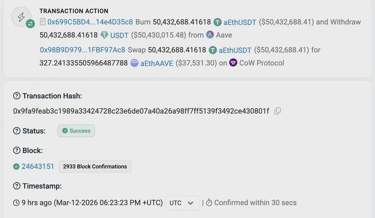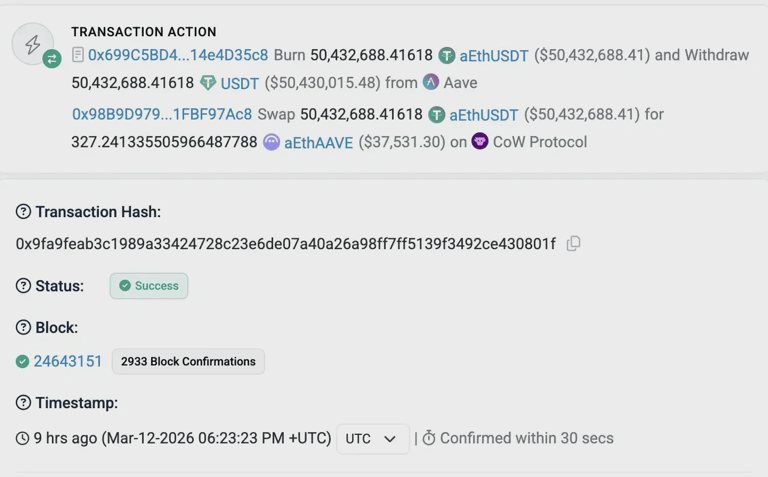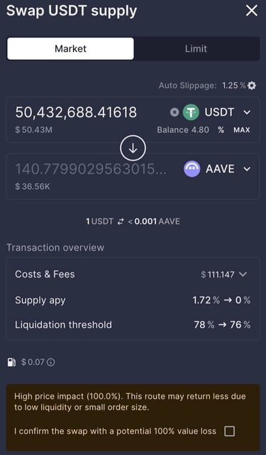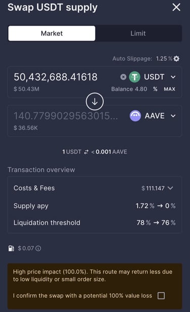 Step 1 - 巨額換幣: 該名巨鯨用戶試圖透過 Aave 的前端介面,單筆將高達 50,432,688 USDT 兌換成 AAVE。