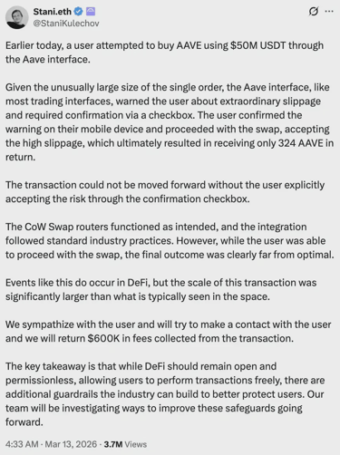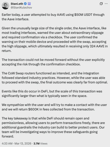 退還部分款項:Aave 承諾將這筆交易所產生的 60 萬美元手續費(Fees) 全數退還給該用戶,以盡一點心意。
