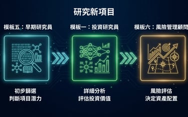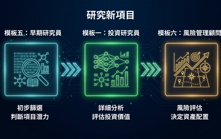 研究新項目: 先用「模板五:早期研究員」做初步篩選,如果值得深入,再用「模板一:投資研究員」做詳細分析,最後用「模板六:風險管理顧問」評估要配置多少。