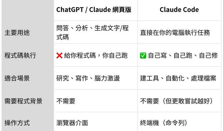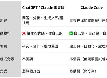 簡單來說,如果只是需要「得到資訊或想法」,用 ChatGPT 或是 Claude 網頁版本就夠了;但如果更進一步,需要「做出一個工具甚至完整項目」,用 Claude Code 會帶來完全不同的體驗。