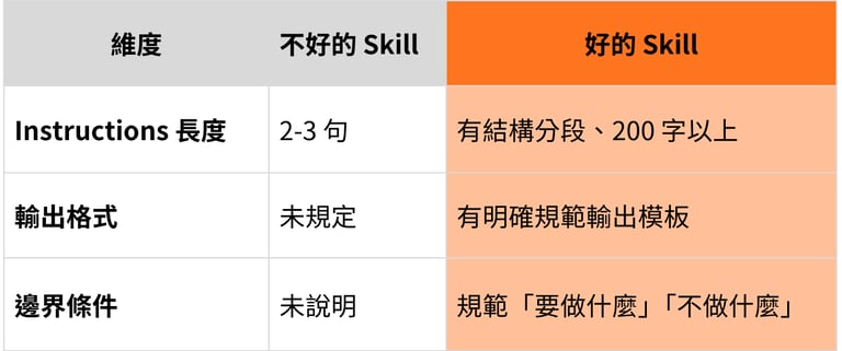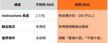 如果第一次輸出不符合預期,不要只改單次 prompt。更好的做法是回頭修改 Skill Instructions。