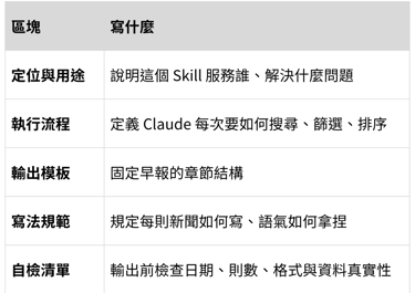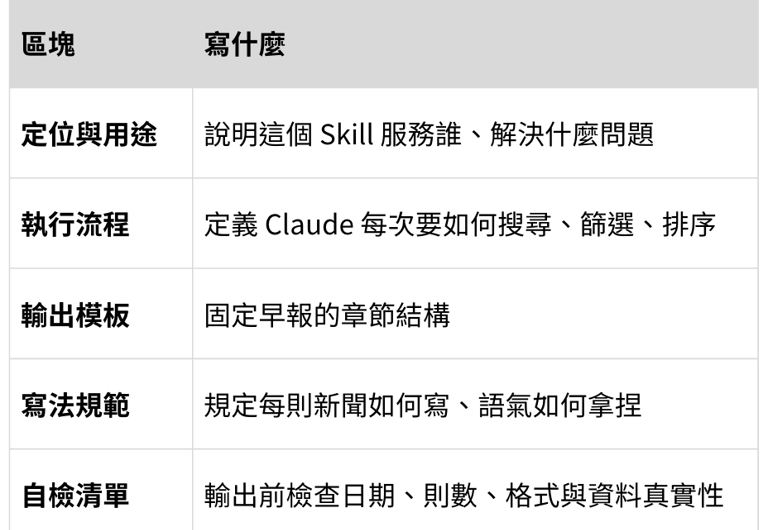 在設計這個 Skill 時,我會把它拆成五個部分定義: