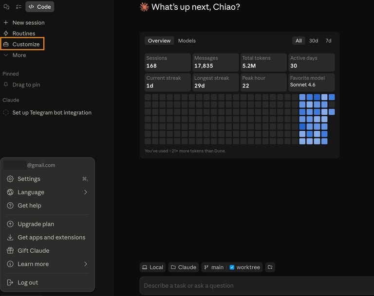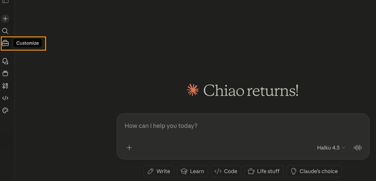 網頁版的 Claude,同樣在左側功能欄找到 Customize,選擇 Skill