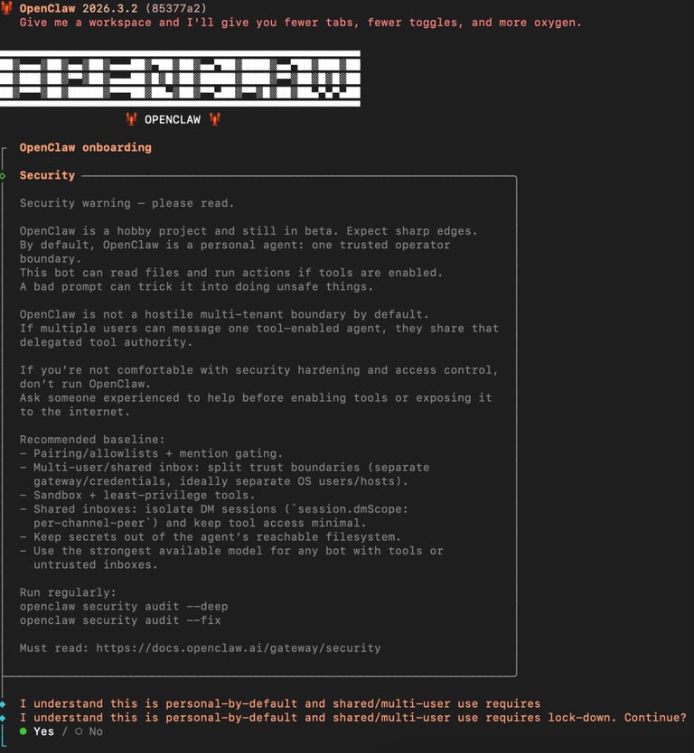 安裝完成後,輸入以下指令啟動設定嚮導(onboarding wizard):"openclaw onboard"