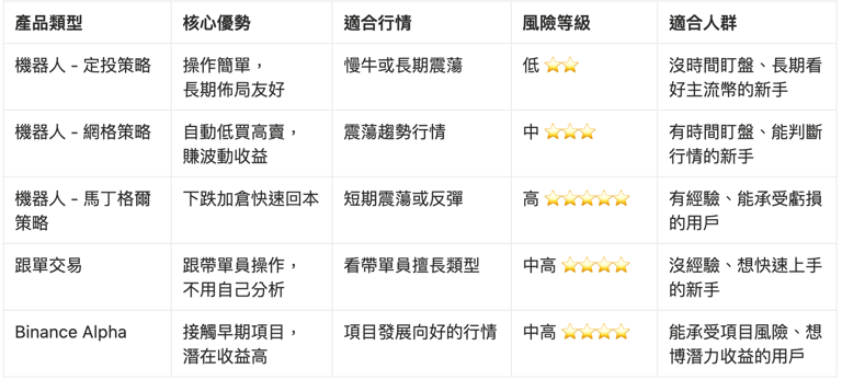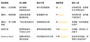 產品選對不盲目: 入門選定投 (低風險),進階試網格/跟單。探索 Alpha 要慎行,忌跟風高收益。