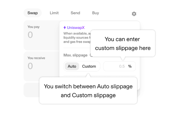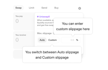 DeFi 市場的價格變動極為迅速。「滑點」是指從您按下交易確認鍵到交易在區塊鏈上被礦工打包完成的這段時間差內,資產價格可能發生的波動。 舉例來說,若價格在交易過程中對您不利,最終您收到的 UNI 可能會比預期的少。為了避免這種損失,Uniswap 允許您設定一個「滑點容忍度」(Slippage Tolerance)。設定滑點容忍度 🔧:
