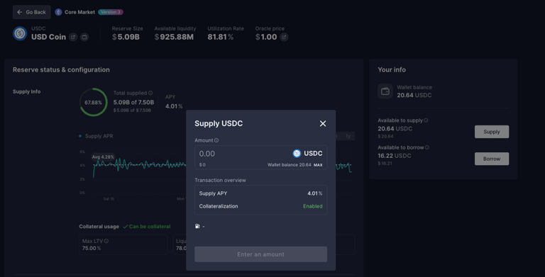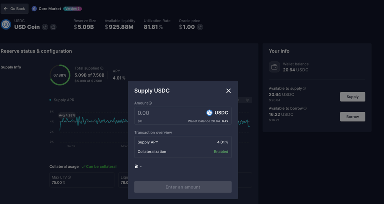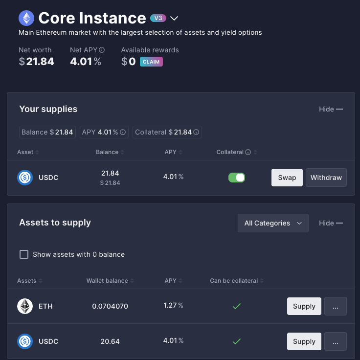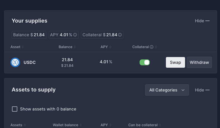 交易成功後,您便可以在 Aave 的「儀表板」(Dashboard) 頁面中,看到您已存入的 USDC 資產總額。同時,您會發現系統會顯示您的存款正在實時累積利息,年化收益率 (Supply APY) 也會清晰列出,讓您隨時追蹤資產增長情況。