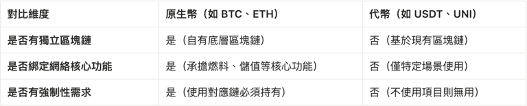 Crypto 分「原生幣」(有獨立底層鏈,如 BTC、ETH)和「代幣」(依附現有鏈,如 USDT、UNI),底層架構決定定位